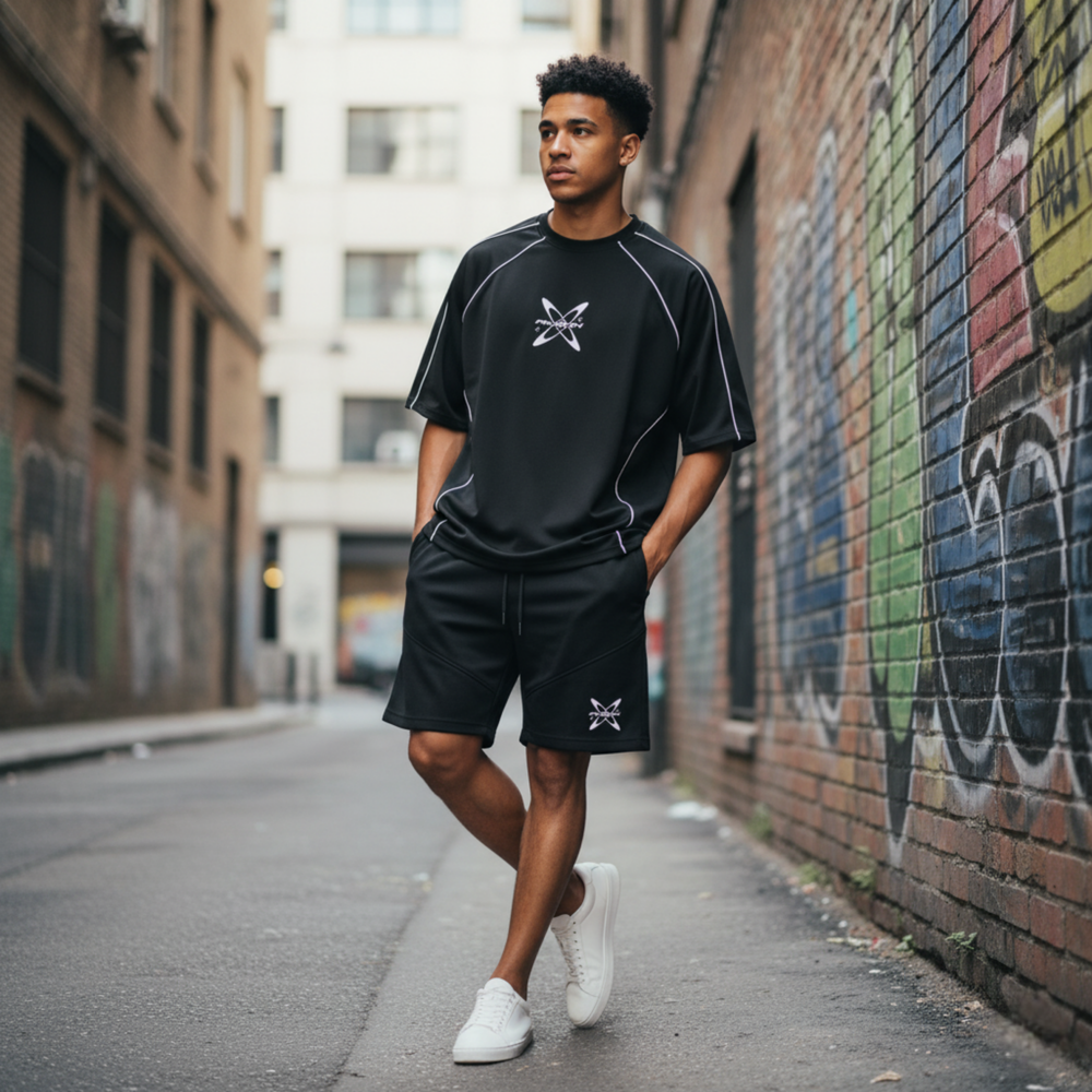 Produits fabriqués avec des tissus premium, nos ensembles reflètent l’identité AY9ONBRAND, une fusion entre audace urbaine et raffinement futuriste